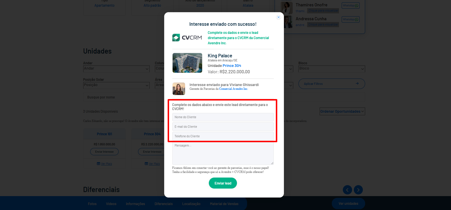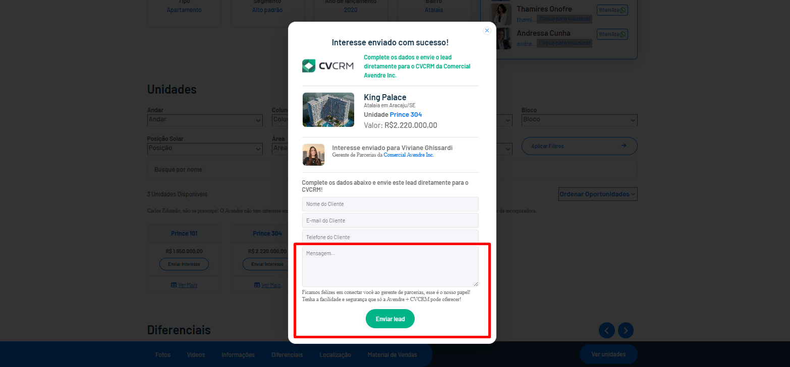 Inclua uma mensagem personalizada para o gerente de parceria e envie o lead para o CV CRM.