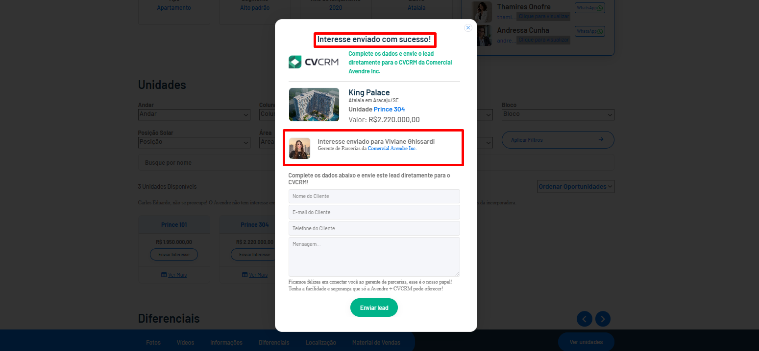 Ao preencher essas informações do cliente, um lead será cadastrado automaticamente na base do CV CRM da incorporadora
