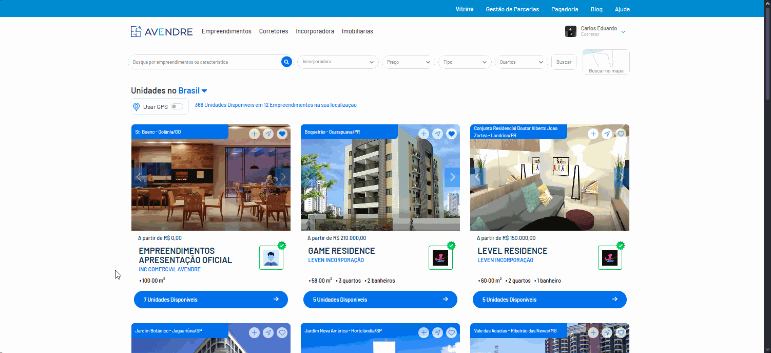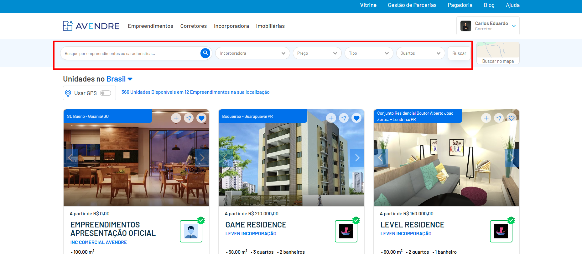 Você pode utilizar os filtros por incorporadora, localização, tipo, faixa de preço ou número de quartos.