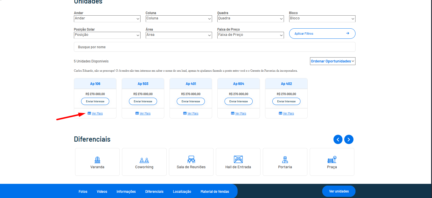 Ao abrir a página do empreendimento, você verá todas as informações detalhadas, incluindo metragem, número de quartos, banheiros e suítes.
